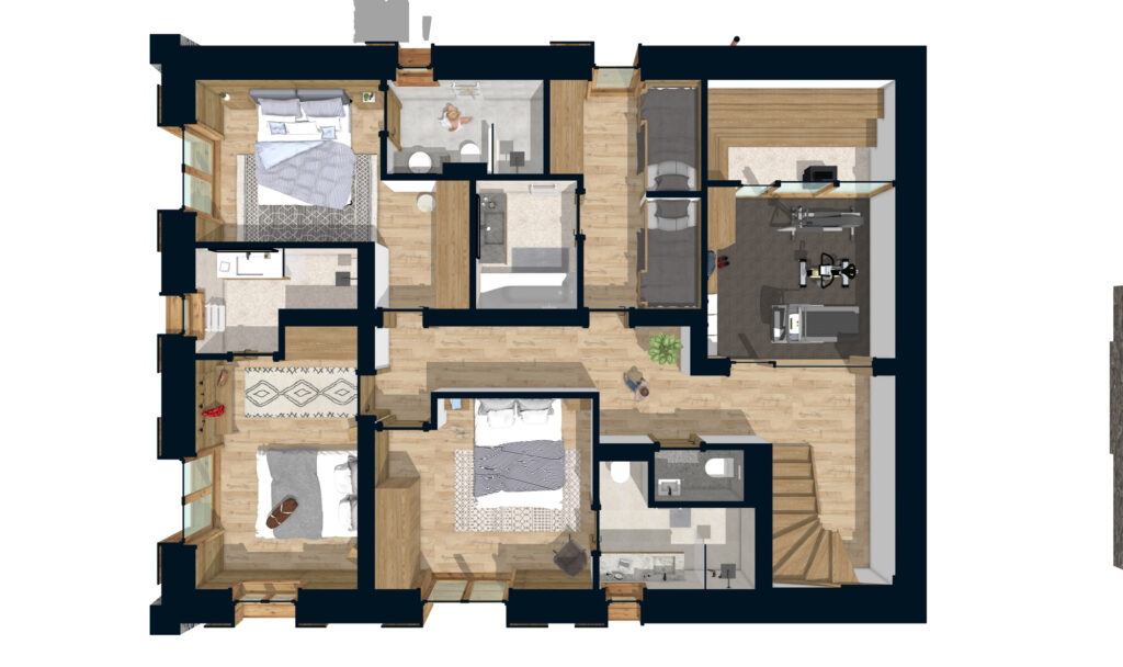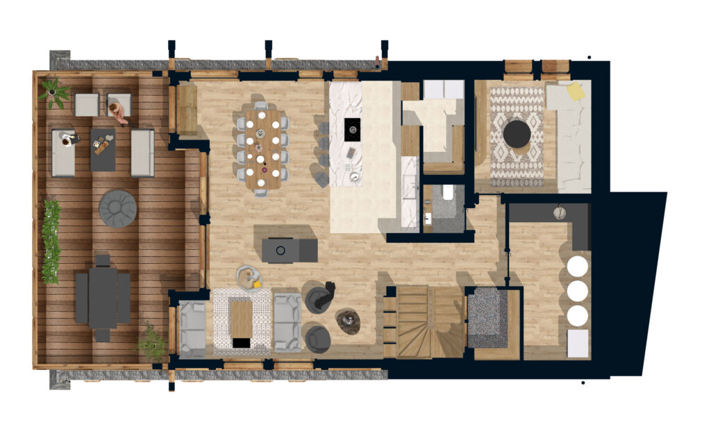 Everything is designed to accommodate large groups or extended stays: a spacious, light-filled cathedral-ceilinged living room, a high-end kitchen with an adjoining pantry, and a massive 44 m² terrace with panoramic views. On the sleeping side, there are 6 very large bedrooms, including a master suite, all equipped with their own private bathrooms.